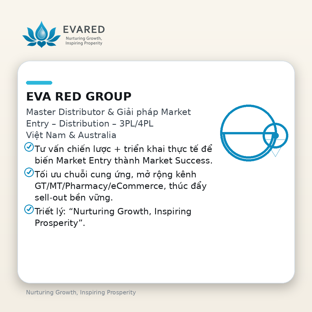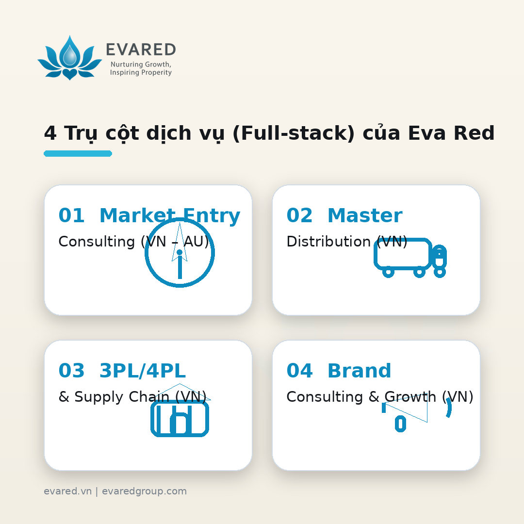 Eva Red Group là đơn vị tư vấn và triển khai Market Entry – Distribution – 3PL/4PL – Brand Consulting cho hai thị trường Việt Nam và Australia. Chúng tôi hoạt động như tổng thầu (Master Distributor), giúp thương hiệu quốc tế và doanh nghiệp trong nước gia nhập thị trường, đảm bảo tuân thủ pháp lý, tối ưu chuỗi cung ứng, mở rộng kênh GT/MT/Pharmacy/eCommerce, và thúc đẩy sell-out bền vững.