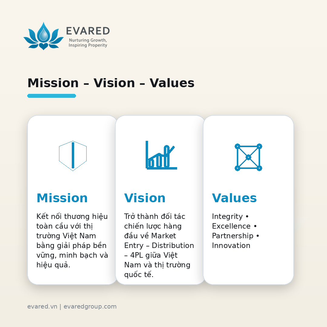 Tầm nhìn (Vision): Trở thành đối tác chiến lược hàng đầu về Market Entry – Distribution – 4PL giữa Việt Nam và thị trường quốc tế.